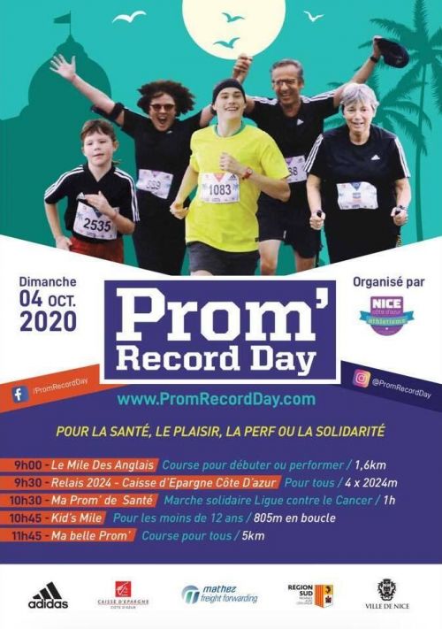 Le Prom' Record Day est un événement d’athlé « naturel » dans un environnement urbain (Marcher, courir…), accessible à tous les publics (Enfants, adultes, seniors, familles, entreprises…), sur le site exceptionnel de la promenade des Anglais. Organisé par le Nice Côte d’Azur Athlétisme, 1er club de la région Sud PACA