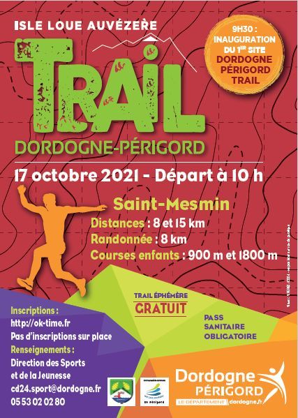 Le Conseil départemental de la Dordogne, en partenariat avec la Communauté de communes Isle Loue Auvezère en Périgord, organise une journée « trail et randonnée » pour l’inauguration des parcours permanents DORDOGNE PERIGORD TRAIL. Ces courses traverseront les communes de SAINT MESMIN, GENIS et SAVIGNAC LEDRIER.