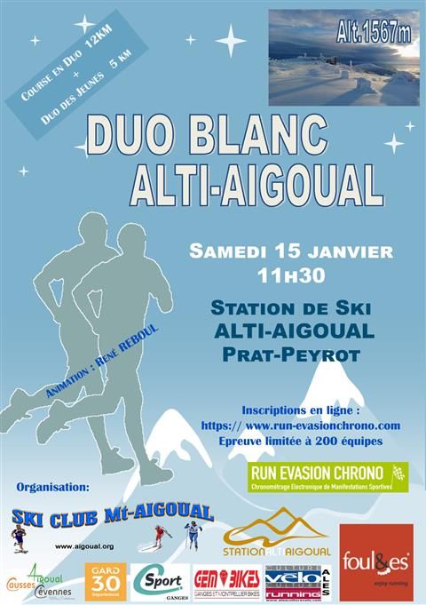 Le Duo Blanc Alti Aigoual est une course pédestre en milieu naturel par équipe de deux coureurs sur terrain enneigé. Elle se déroulera à la Station de Ski ALti Aigoual à Prat-Peyrot (Gard). Le parcours de 12km (2 x 6km) est réalisé en forêt au coeur du massif de l'Aigoual dans le Parc National des Cévennes, sur chemins et sentiers forestiers. Le parcours devrait être enneigé, les chaines sont donc conseillées et les bâtons autorisés.