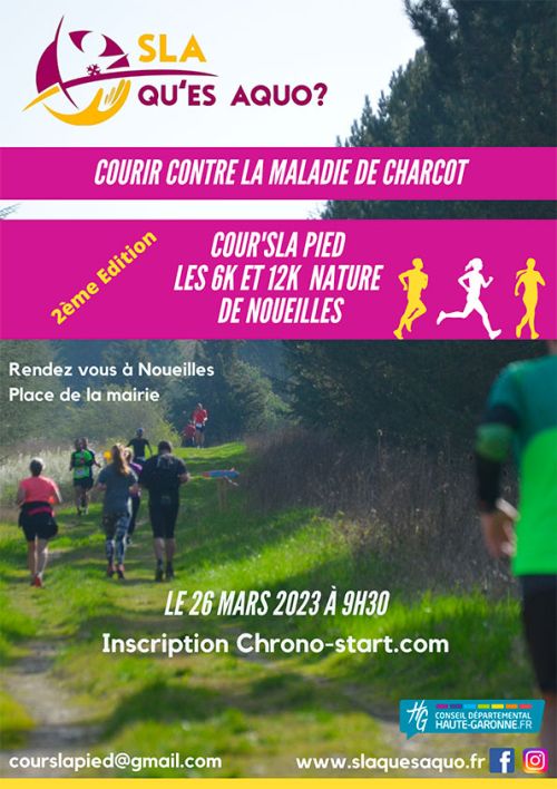 Cour’SLA pied vous propose deux courses sur des distances de 6 et 12 km en pleine nature, sur les coteaux du Lauragais. Chaque euro récolté participera à la recherche contre la SLA (Maladie de Charcot). Notre association SLA QU’ES AQUO a été créée à l’initiative de malades, d’aidants familiaux et d’auxiliaires de vie Elle a pour objectifs: De soutenir, informer, aider et accompagner les malades et leurs familles dans cette épreuve De soutenir et aider les chercheurs en collectant des fonds pour la recherche clinique et fondamentale.