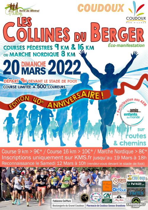 Course pédestre "Les collines du berger. Il s'agit d'une course mixte (routes et chemins) de 13 km avec comme points forts la montée des 4 termes et la découverte des sentiers de notre colline aux couleurs typiquement provençales. Notre course est un rendez-vous apprécié par les coureurs licenciés ou non des Bouches-du-rhône sensibles au caractère convivial de notre organisation. Notre marque de fabrique est notamment la constitution d'un buffet de qualité avec beaucoup de productions maison ainsi que d'un buffet "gastronomique" dans lequel nous mettons en avant les produits locaux. Depuis 5 ans, nous nous inscrivons dans un projet tourné vers plus de solidarité en affichant un tarif particulièrement bas.