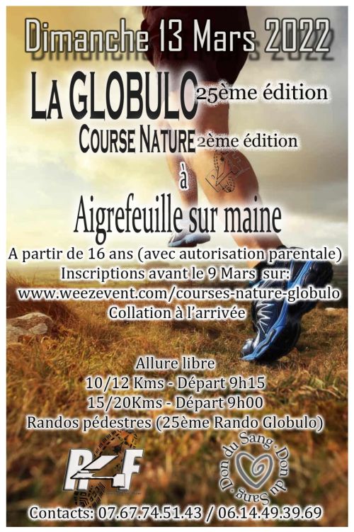 En parallèle de la traditionnelle RANDO GLOBULO organisée par l'Association du Don du Sang, Run For Fun, association de running de loisir organise 3 courses nature non chronométrée. Pour 5€ on choisit sa distance... Aucune hésitation ! Possibilité de consignes