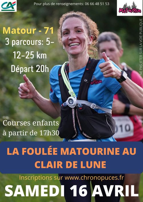 La Foulée Matourine revient avec une édition Au clair de Lune, en mode "SEMI NOCTURNE". Toujours dans la convivialité, la bonne humeur, la simplicité mais aussi avec l'esprit de compétition, venez découvrir Matour et ses environs, souvent appelée la petite suisse, MATOUR est entre le haut clunisois, le mâconnais, le beaujolais et le charolais.