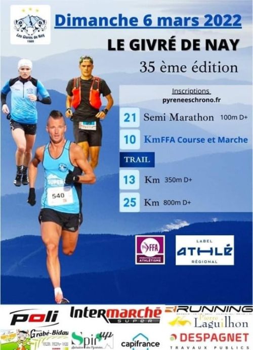 Le Givré de Nay organisé par l’association « Les Givrés de Nay » et la ville de Nay. Au programme, un Semi-marathon et un 10 km route labellisé FFA course et marche. S’ajouteront 2 trails de 13 km et 25 km. Départs et arrivées auront lieu au stade de Nay.