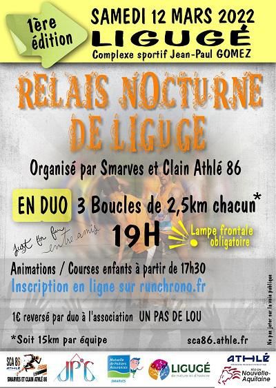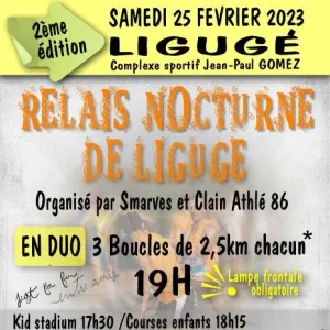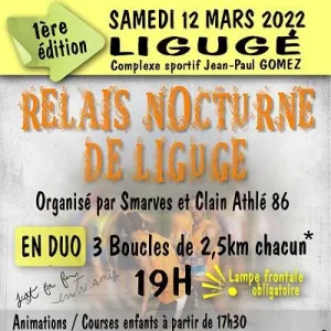 Le club Smarves et Clain Athle 86 organise le Relais Nocturne de Ligugé, une course pédestre en relais par équipe de deux coureurs où Chaque coureur effectuera trois tours de 2,5 km, soit une distance de 7,5 km.
