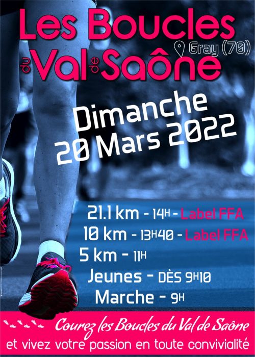 Le semi marathon se déroule sur une seule boucle, parcours agréable mi urbain mi-campagne longeant les rives de la saône sur plusieurs kms. côte de 400m après le premier km, ensuite légèrement descendant ou plat jusqu'à l'arrivée. Catégories autorisées JU->V5.