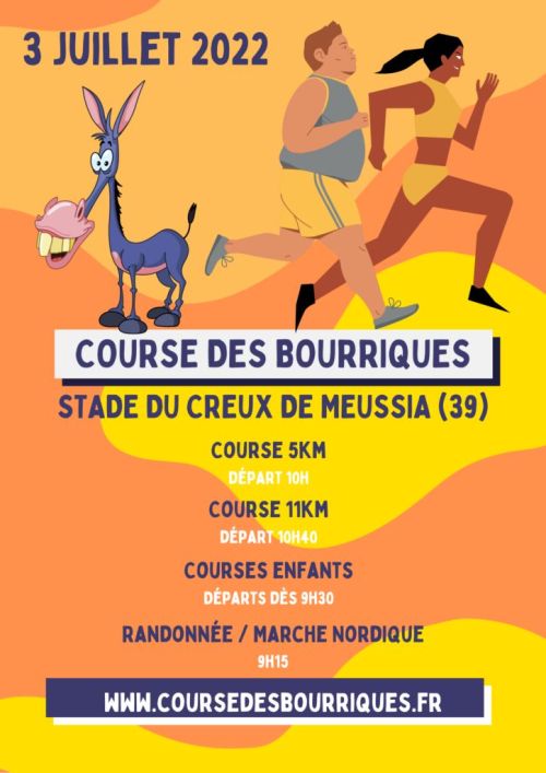 Le Foyer Rural de MEUSSIA sera heureux de vous accueillir sur la course des bourriques. Cette édition se déroulera au stade du Creux de COYRON. Au programme, randonnée, courses baby et enfants, populaires, et la traditionnelle Bourriques sur 11 km, avec vue sur la retenue du barrage de Vouglans.
