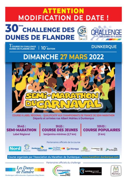 Semi-Marathon du Carnaval avec Trois courses : Une course de 1800m ouverte pour les benjamins (1 tour) et les minimes 3400m (2 tours), Un Semi-marathon départ à 10h00, Un 5kms départ à 10h20.
