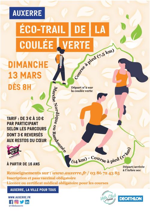 - Course Trail chronométré de 7,5 kms, départ de la Coulée Verte à son point culminant, boulevard Montois à côté de la chaufferie biomasse à 10h45, arrivée à l’Arbre Sec. Un transport collectif gratuit est proposé au départ de l’Arbre Sec