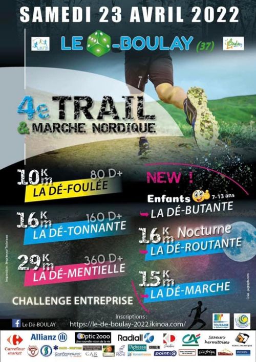 Trail "Le Dé-Boulay" qui vous fera découvrir notre belle campagne des communes de Le Boulay (à 25 minutes de Tours), Neuville-sur-Brenne, Authon et Villechauve . Cette course organisée par les Abons'Tours. Cette course est au profit de l'association "Magie à l'hôpital" et son action Je cours pour les enfants. L’association « Magie à l’hôpital » réalise bénévolement des spectacles de magie pour des enfants hospitalisés et leurs familles.