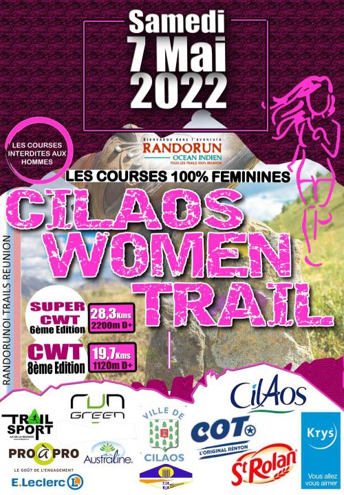 La Cilaos Women Trail (CWT), 100% féminin. Deux épreuves au programme, la Super CWT propose un parcours de 28,3kms avec un dénivelé positif de 2 200m, et la Cilaos Women Trail sur un tracé plus court de 19,7kms avec un dénivelé positif de 1120m.