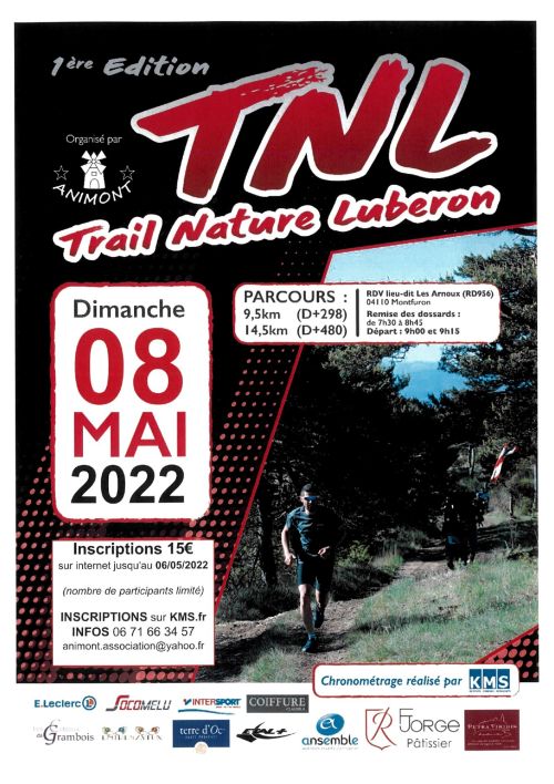 L’association AniMont organise le Trail Nature Luberon. Les organisateurs vous ont préparé deux parcours qui vous permettront de parcourir des sentiers dans un environnement sauvage et préservé, vous courrez majoritairement sur sentiers, en pouvant admirer la chaine des Alpes, avec vue à 180° de la montagne Sainte Victoire et la montagne de Lure.