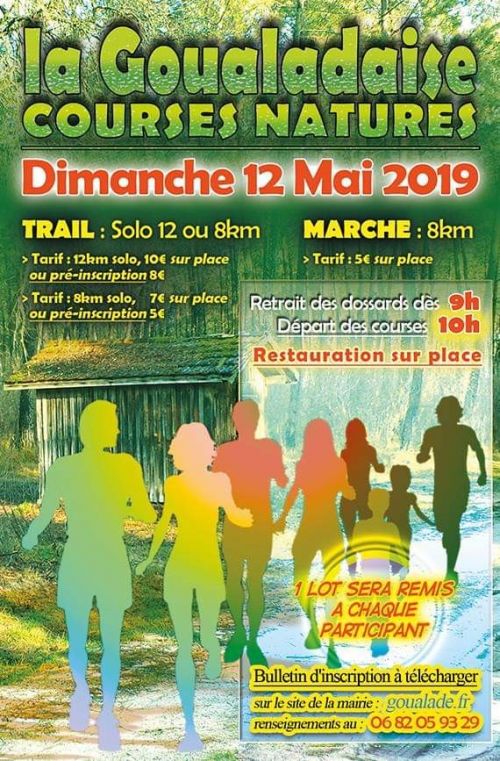 La Goualadaise est un événement sportif présentant une course pédestre nature et une marche organisée par le comité des fêtes de Goualade. 2 distances proposées pour le trail : 12 et 8 kms ; 1 distance pour la marche : 8 kms. La remise des dossards se fera à la salle communale à partir de 9h.