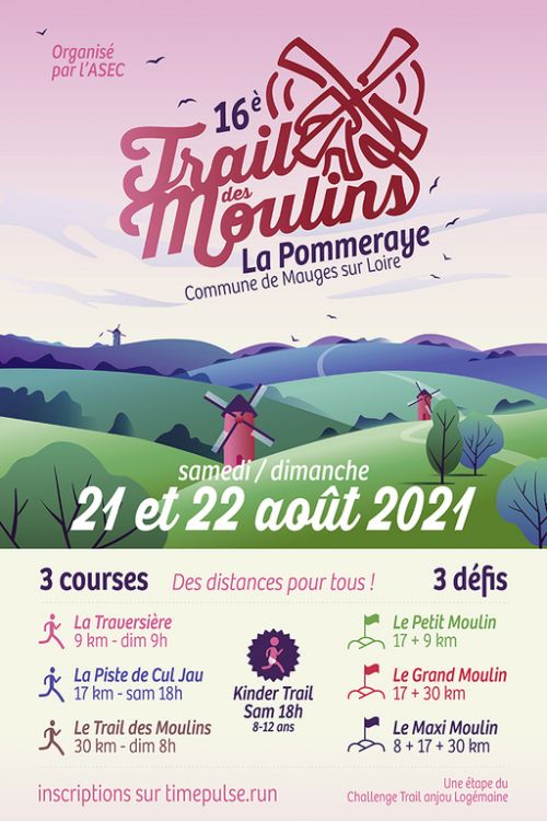 16è édition du Trail des Moulins, organisé par l'ASEC. Découvrez la Vallée de la Loire et ses fours à chaux, les vallées des moulins et du ruisseau St Denis avec leurs ponts et jardins sauvages. Le Trail des Moulins participe au Challenge départemental Trails Anjou Ouest France / Logémaine. Pour les plus aguerris, les Défis "Petit" ou "Grand Moulin" permettent la pratique de trails entre traces, traversées de ruisseaux, sentiers, chemins et routes de campagne sur les 2 jours : Défi ‘Petit Moulin’ (17 km + 9 km) Défi ‘Grand Moulin’ (17 km + 30 km)