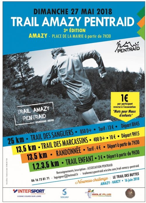 Nous avons voulu vous proposer une course atypique, presque entièrement dans les bois. Le départ dans les rues d'Amazy vous permettra de vous mettre en jambe avant d'attaquer ce trail au profil accidenté, passant tout proche des ruines de la ferme des Aubépins (ça sera l'occasion pour les locaux de vérifier qu'il ne s'agit pas d'une légende). Nous avons souhaité exploiter du mieux possible le potentiel de notre forêt en terme de dénivelé. Accessible a tous, a condition d'être un minimum préparé, nous espérons que vous passerez un bon moment avec nous!