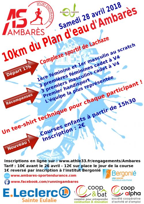 22ème édition du 10km du Plan d'Eau Ambares. Boucle de 10 km dans les rues d'Ambares, en passant autour du lac de la Blanche, le parcours de cette course est vraiment agréable et très roulant. Le départ se fait avenue de Grandjean, Pour ceux qui hésiteraient encore, sachez que l'arrivée est "exceptionnelle", elle se joue autour de la piste d'athlétisme ! Retrait des dossards le jour de la course à partir de 14h30.