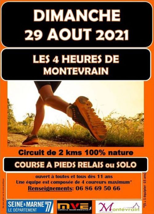7ème édition des 4 heures de Montévrain (parc des frênes) Relever le défi d'une course nature pas comme les autres en SOLO, en DUO ou en relais par équipe de 3 à 5 personnes (homme, femme, mixte). Sur un circuit 100% nature de 2.160 km à parcourir pendant 4 heures.