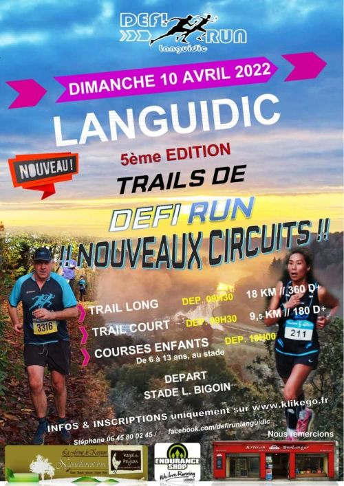l’association DEFI RUN vous propose de découvrir de nouveaux circuits empruntant chemins et sentiers communaux ou privés, traversant bois (Pont Screign, Coët Megan, Pont Kerran) champs, prairies, cours d’eau (Rivière du Pont du Roc’h, Le Rion, La Divine) et ruisseaux, ponctués de courtes portions de routes sur deux nouvelles distances.