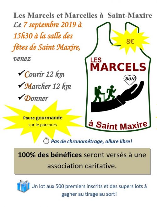 Les 10 Bornes de ST MAXIRE deviennent : Les Marcels et Les Marcelles à Saint-Maxire. Pourquoi «Les Marcels et Les Marcelles » ? Tout simplement parce qu'en lieu et place du traditionnel maillot technique offert à chaque coureur, nous remettons.... Un Marcel ! L'objectif est maintenant de reverser la totalité de nos bénéfices à une oeuvre dont l'objet sera médical. Animation enfants pour les 5-15 ans, les « P’tits Marcels et p'tites Marcelles », qui permettront de récolter des fonds supplémentaires, mais aussi de réunir les familles, (les grands et les p’tits Marcels et p'tites Marcelles).
