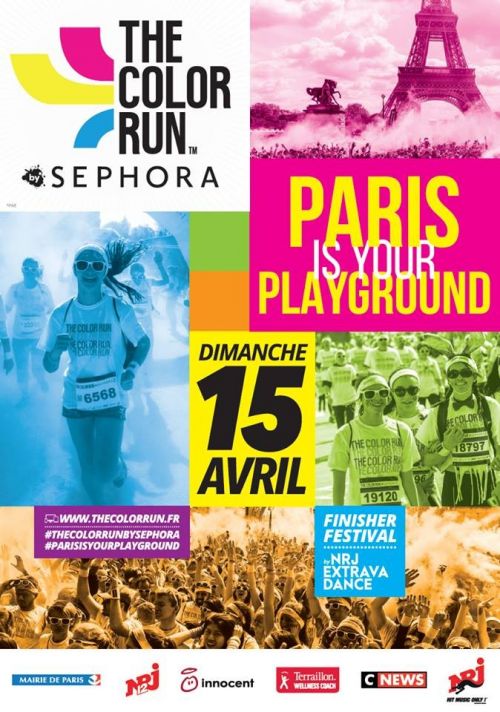 Départ : Hotel de Ville à partir de 9h toutes les 15min. Kit départ inclus : Dossard, T-shirt Blanc, Lunettes Sephora, Bandeau, Tatouages temporaires. Kit arrivée : Sac de poudre colorée, Ravitaillement Encas, Accès Festival.