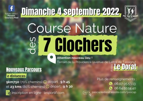 La course des 7 clochers est composé de deux parcours ayant des parties communes, le 23km retrouve le 9kms et se sépare au 9,5 kms soit 3 kms communs. Le nombre de participants est limité à 250 coureurs.