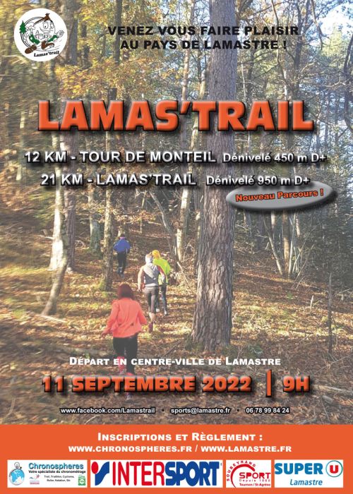 Le « LAMAS’TRAIL » est organisé par l’Office Municipal des Sports de Lamastre en partenariat avec les mairies de Nozières et Empurany, est une épreuve de 35 km à parcourir en solo ou en relais à deux ou à trois. Le départ est donné devant l’Office de Tourisme de Lamastre et l’arrivée se fait en le centre-ville. Le parcours est entièrement balisé et emprunte des chemins à travers la campagne.