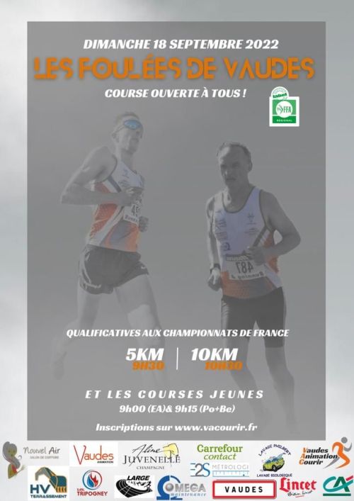 Les Foulées de Vaudes. Le parcours change légèrement pour améliorer le spectacle. Départ et arrivée Grande Rue face à la mairie de Vaudes. Chronométrage du 5 et 10 km par puce.