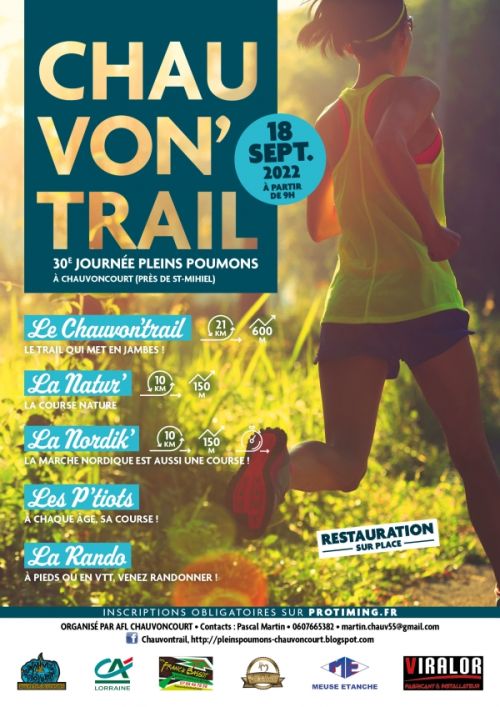 L’AFL de Chauvoncourt innove cette année, dans le cadre de sa traditionnelle Journée Pleins Poumons, en organisant son le Chauvon'Trail C’est un trail qui emprunte de nombreux singles, des chemins forestiers, quelques chemins blancs ou herbeux, et quelques hectomètres de route goudronnée.