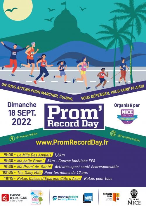 Le Prom' Record Day est un événement d’athlé « naturel » dans un environnement urbain (Marcher, courir…), accessible à tous les publics (Enfants, adultes, seniors, familles, entreprises…), sur le site exceptionnel de la promenade des Anglais. Organisé par le Nice Côte d’Azur Athlétisme, 1er club de la région Sud PACA