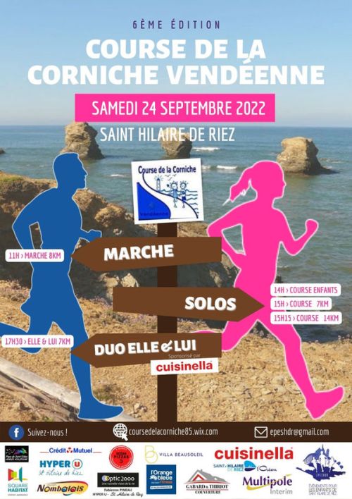 La course de la Corniche Vendéenne est organisée bénévolement par les membres de l'APE des écoles de Sion sur l'Océan en partenariat avec le "Jogging Club de Saint-Hilaire". Forte des deux premières éditions qui ont rencontré un vif succès et de retours très enthousiastes de la part de participants, la Course de la Corniche Vendéenne vous donne rendez-vous pour une nouvelle édition avec 4 courses : 7 et 14 km, "enfants" et "elle et lui" sur un parcours doté d'un panoramique exceptionnel.