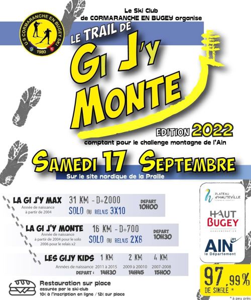 Le Ski Club de Cormaranche en Bugey organise la 9ème édition du trail La Gi J'y monte sur le magnifique site de la Ferme Guichard. Peut se courir en relais de 2 coureurs ou en solo.