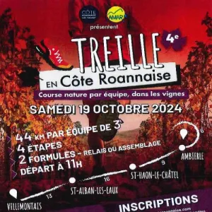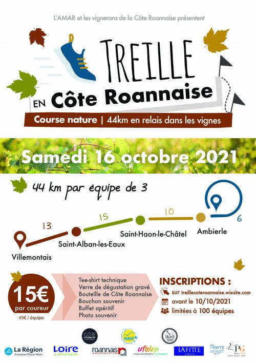 Relais par équipe de 3 sur 44km en 4 étapes dans le vignoble de la Côte Roannaise (42). Trois premières étapes en individuel (équipier 1 : 13km, puis équipier 2 : 15km, puis équipier 3 : 10km) puis étape 4 les 3 équipiers ensemble pour 6km.