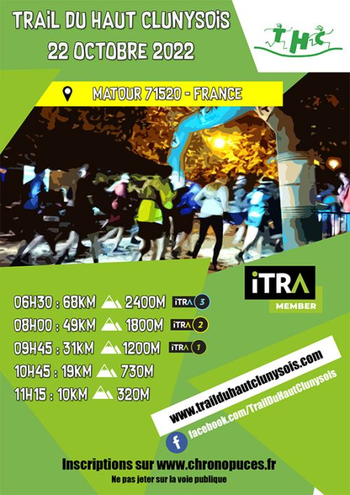 Le Trail du Haut Clunysois (THC) avec 5 courses au programme de cette journée sportive, avec circuits modifiés ! Vous ne découvrirez ces circuits que lorsque que vous serez en course ! Vous aurez le plaisir de courir en pleine nature sur des chemins de campagne et de massifs forestiers dans notre belle région du Haut Clunysois en Bourgogne du sud.