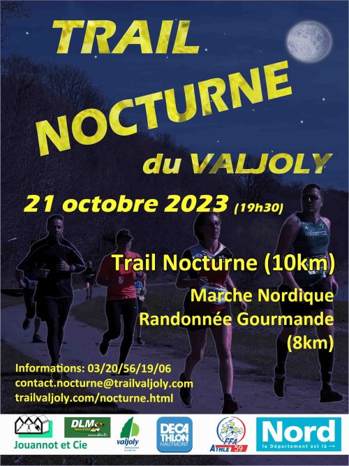 Le comité du nord d'athlétisme organise la Nocturne du ValJoly. Dans ce cadre magnifique un parcours Trail vous sera proposé (départ à 19h30), également une randonnée gourmande - marche nordique se verra inscrite au programme : distance de 6 ou 10 km (départ 19h30 après le départ du trail)