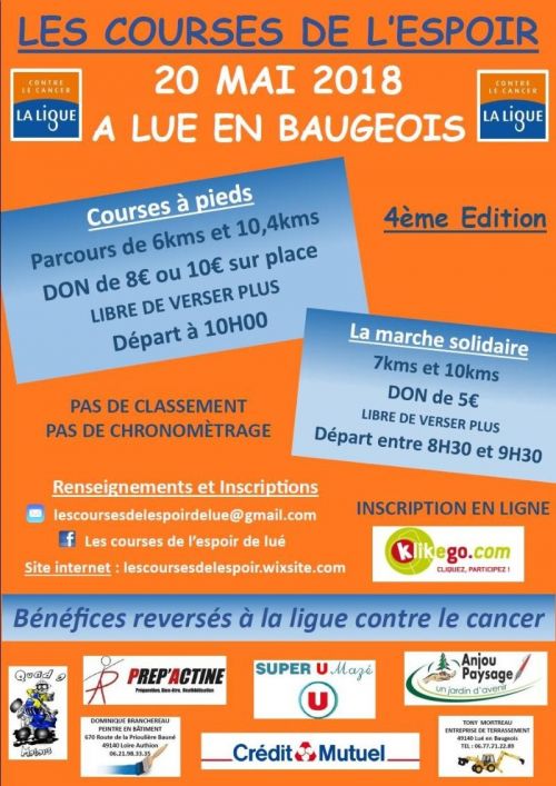 Les courses de l'espoir de Lué sont organisées pour collecter des fonds pour la ligue contre le cancer du 49. Les parcours sont vallonnés variant entre chemins et routes.Epreuve sans classement, Catégories autorisées CA->V5.
