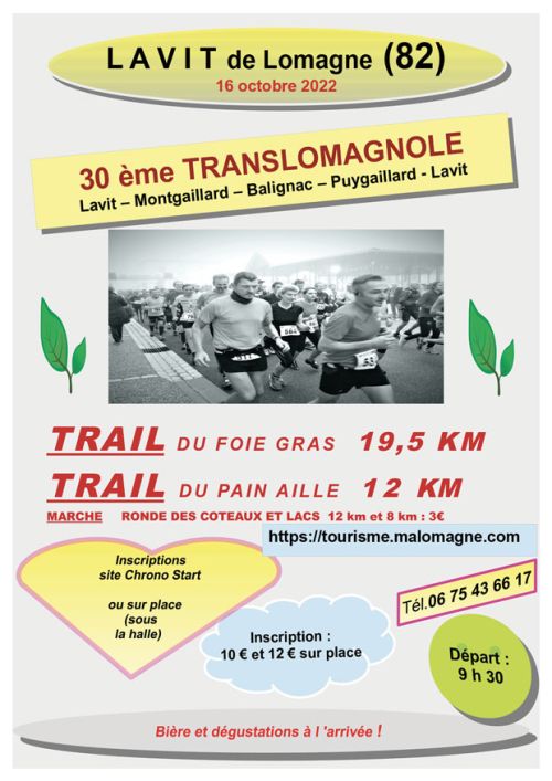 La Translomagnole avec deux trails au départ et retour de la Halle de Lavit. Trail du foie gras et trail du pain aillé, et marches : ronde des coteaux et lacs 12 et 8 km.