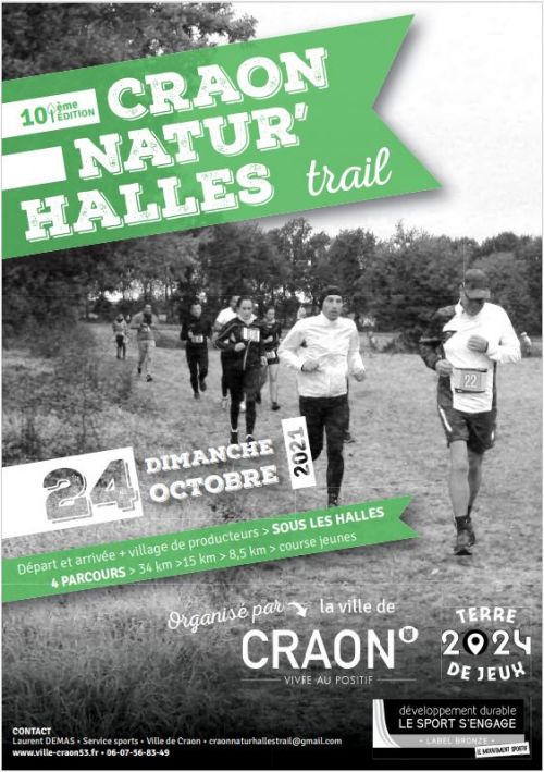 11ème édition du Craonnatur'halles trail le dimanche 23 Octobre 2022 avec 5 courses au programme ( 37km, 26km, 16 km, 8.5km et course jeunes). Ce trail permet d'allier une épreuve sportive à une découverte du patrimoine craonnais L'an dernier, notre manifestation a été labellisée de la médaille de bronze dans le cadre du projet "Développement durable, le sport s'engage" organisé par le Comité National Olympique et Sportif Français. Nous chercherons à être encore plus proche de nos coureurs et de notre objectif d'un trail vert, puis que nous repostulons sur ce label.