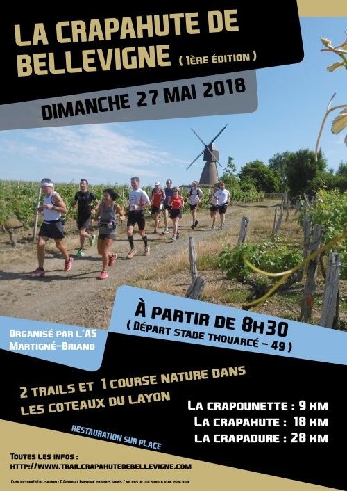 « la crapahute de bellevigne », est organisée par l’AS Martigné Briand Trois parcours sont proposés : La crapounette de 9 km (cadet à master), la crapahute de 18 km et la crapadure de 28 km (junior à master). Le départ et l’arrivée de l'ensemble des courses ont lieu au stade – complexe sportif de Bellevigne en Layon. Nous voulons vous faire partager notre terrain de jeu et vous faire découvrir notre région (le Layon), qui se situe au coeur de l'Anjou... en crapahutant dans nos coteaux, avec des montées, des descentes, de splendides points de vues, de belles vignes qui produiront entre autres, le célèbre Bonnezeaux !
