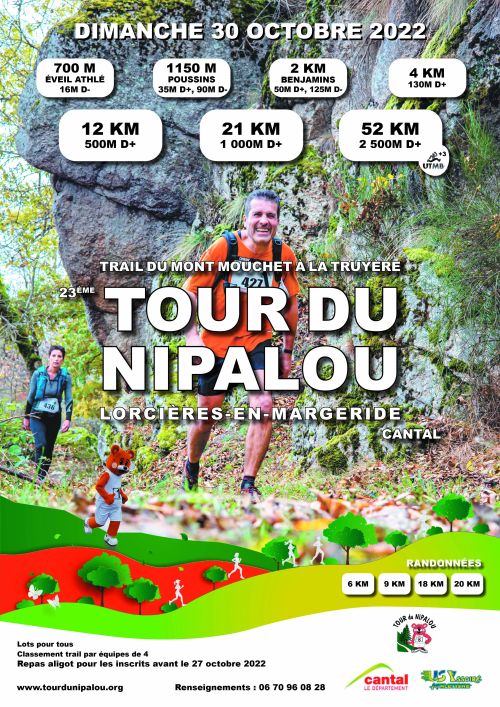 Le Tour du Nipalou aura lieu à Lorcières en Margeride (Cantal, Auvergne). Le 52 km de cette édition est qualificatif pour l'Ultra Trail du Mont-Blanc ou autres à hauteur de 3 points Endurance. Certification de l'ITRA