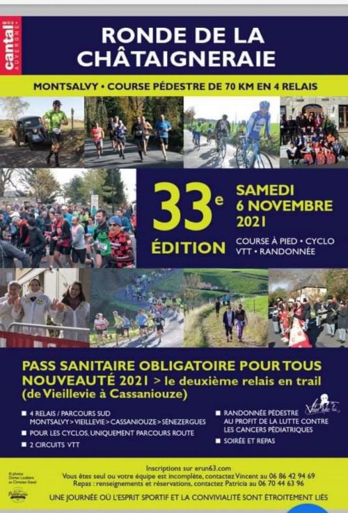 Une course en relais de 4 coureurs. Départ à horaire fixe, à la découverte de chaque village du canton où vous pourrez déguster des produits locaux. La Ronde de la Châtaigneraie c'est aussi la convivialité, la bonne humeur, le dépassement de soi, mais aussi pouvoir se balader en cyclo, en VTT ou à pied.