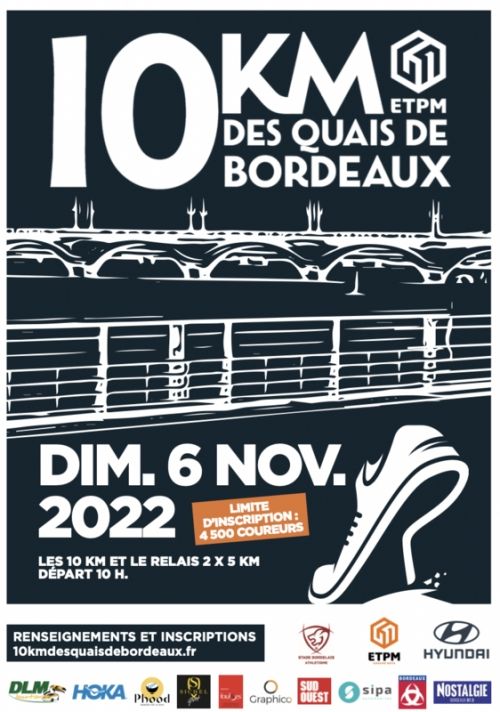 Les 10 km des Quais de Bordeaux, organisé entièrement par des Bénévoles de Bordeaux-Athlé (section d’athlétisme du Stade-Bordelais). Pour les sportifs et coureurs à pied, cette course est devenue un rendez-vous incontournable. Le parcours, mesuré par des officiels de la Fédération Française d’Athlétisme, vous fera découvrir les quais de Bordeaux, le pont Chaban, le pont de Pierre, le miroir d’eau… Les 10 km ETPM des quais de Bordeaux est Label régional de la Fédération Française d’Athlétisme et qualificatif pour les championnats de France.