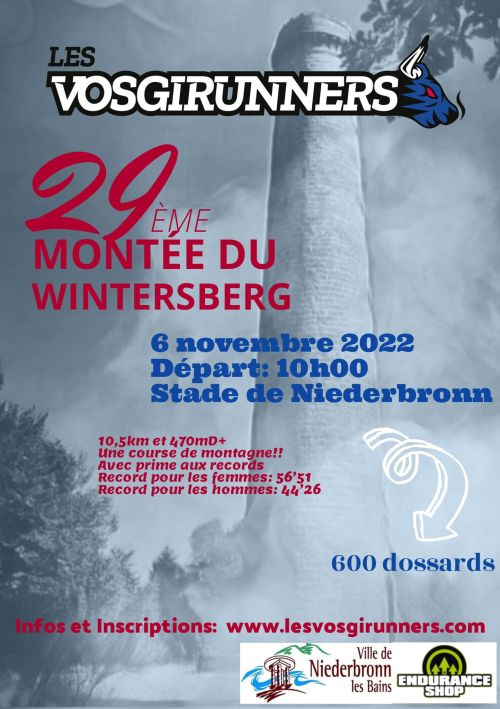 Imaginez l’Automne dans toute sa splendeur, au cœur de la magnifique forêt des Vosges de Grès. Il fait soleil, une légère brume enveloppe la montagne, le vent fait bruisser les feuilles. Imaginez vous entrain de respirer, de courir, de vous dépasser dans ce cadre splendide. Ne résistez pas à l’appel de la forêt ! La Montée du Wintersberg va vous combler. Une course nerveuse, racée, sans concession, où chaque type de coureur pourra s’exprimer, quel que soit son terrain de prédilection : le plat pour ceux qui aiment le rythme, la montée pour les costauds, la descente pour les fadas de vitesse. Un véritable triathlon du coureur à pied ! Une véritable course de montagne qui se déroule chaque année à Niederbronn et nulle part ailleurs...