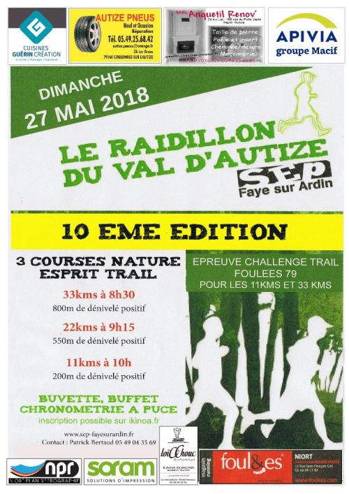 Circuit 100% NATURE alternants sentiers monotraces, chemins d'exploitation, passerelles, à travers la vallée du val d’Autize ; traversée de lieux typiques, (de nombreuses fontaines et lavoirs ; les vallées du Saumort et de l'Autize ; le logis et le pigeonnier de Pouzay) et de 4 communes (Fenioux, Béceleuf, Ardin et Xaintray ). Deux de ces courses font parties du challenge départemental « Foulées »