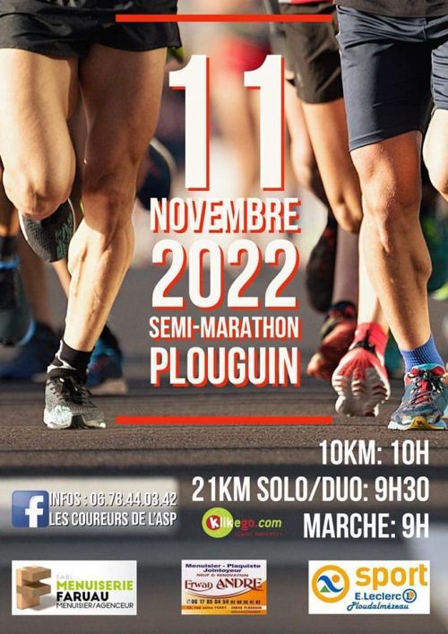 Semi-Marathon de Plouguin. Il y aura de la marche et 3 courses, un 10km, le semi marathon et le semi marathon en relais. Cette année les courses se déroulent le matin.