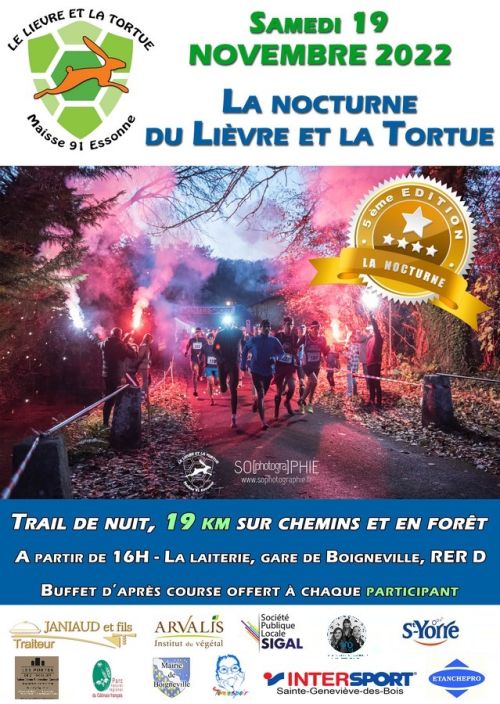 Course de nuit "La Nocturne du Lièvre et la Tortue" de 19 km à la frontale et en autosuffisance. Une seule boucle, tout terrain, accessible à tous, idéal pour un 1er trail de nuit. Nouveau parcours empruntant des chemins forestiers avec un dénivelé de 330 m positif.