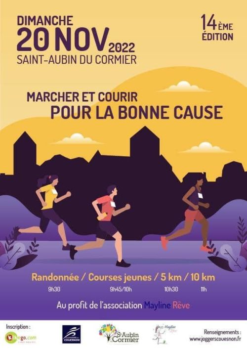 Envie de sport, de convivialité, de solidarité ? Mets tes chaussures et viens courir pour la bonne Cause à Saint Aubin du Cormier ! La totalité des bénéfices sera versée à l'association "Sur les pas de Rachel" qui vient en aide à un enfant atteint de maladie neurologique.
