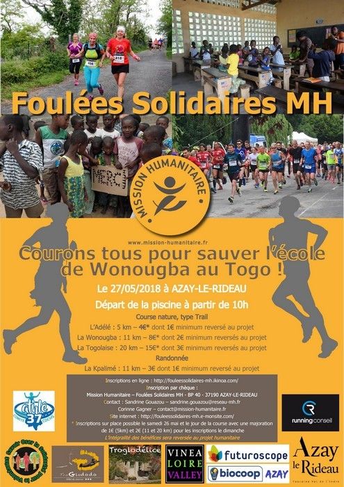Toute l'équipe de MISSION HUMANITAIRE (Organisation de Solidarité Internationale française installée à Azay-le-Rideau) est fière de vous présenter la 2ème édition des FOULÉES SOLIDAIRES MISSION HUMANITAIRE. Ces Foulées Solidaires vous offriront la possibilité de marcher, de courir, voire de sprinter, à proximité du château d'Azay-le-Rideau, dans des paysages typiques de la région, en parcourant bois et sentiers découverts, avec de nombreuses vues sur la vallée de l'Indre et sur des habitats troglodytiques. Nous vous proposons trois courses chronométrées et une randonnée pédestre.