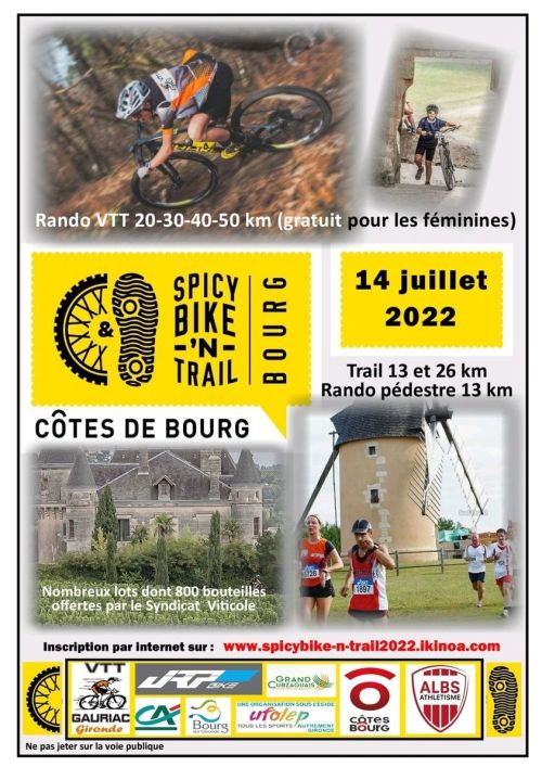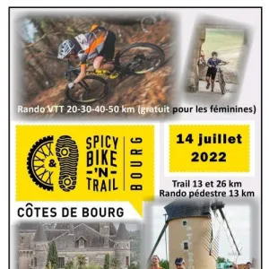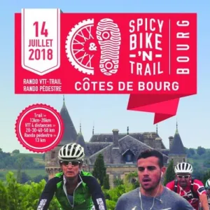 Cette année encore, l'association du VTT Estuaire Club de Gauriac ainsi que le club d'athlétisme de Bourg sur Gironde organisent la quatrième édition du Spicy Bike ‘N Trail. Cette manifestation se déroulera le 14 Juillet 2018 à Bourg sur Gironde en partenariat avec le syndicat des Côtes de Bourg. Les participants pourront s'adonner à la pratique du Trail, de la randonnée VTT ou encore de la randonnée pédestre au coeur des vignobles des Côtes de Bourg. Parking, camping et douches. Restauration et buvette sur place.