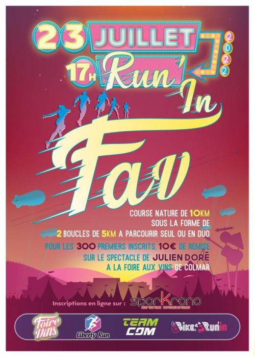 Retour de la Run'in FAV avec une course nature de 10 km à courir seul ou en duo (relais de 2). Le parcours de cette course nature est composé de deux boucles de 5 km dans le vignoble au départ de la Cave de Turckheim.