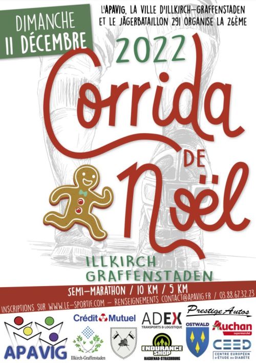Dernière course sur route d'envergure de l'année, la Corrida de Noël d'Illkirch-Graffenstaden attire chaque année 2500 coureurs. Bonne humeur et convivialité sont au programme, le tout aux couleurs de Noël. En plus du 10 Km et du 5 Km, la Ville d'Illkirch-Graffenstaden et leurs partenaires proposent un Semi-Marathon.
